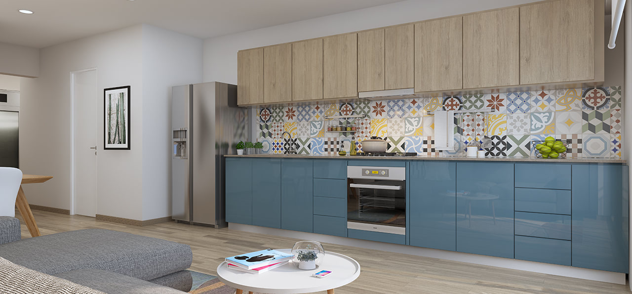 Equipadas con encimera y campana, horno eléctrico y horno microondas, muebles altos y bajos, tableros de granito y zócalos de porcelanato.
