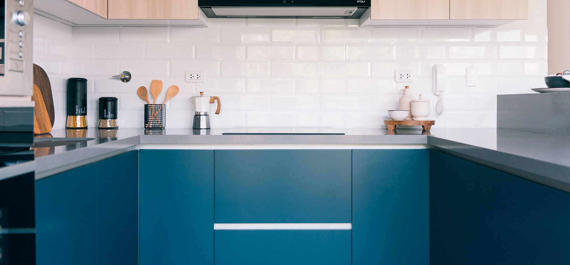 Equipadas con encimera, campana, horno eléctrico y horno microondas, muebles altos y bajos, tableros de Itopker y zócalos de porcelanato.